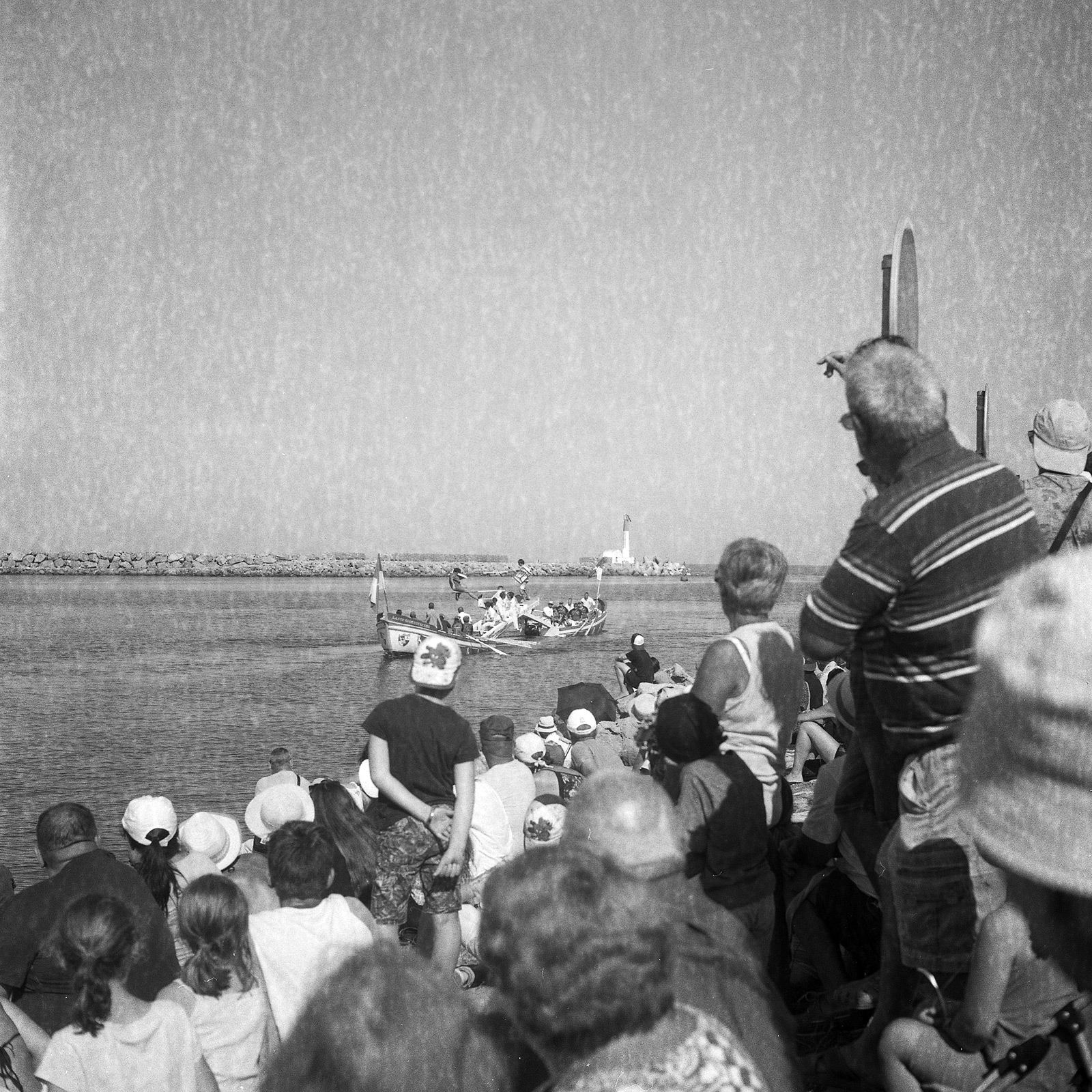 Été 2017, Port la Nouvelle. Joute traditionnelle de bateaux sur le chenal, Ilford fp4 et Yashica mat 124G.