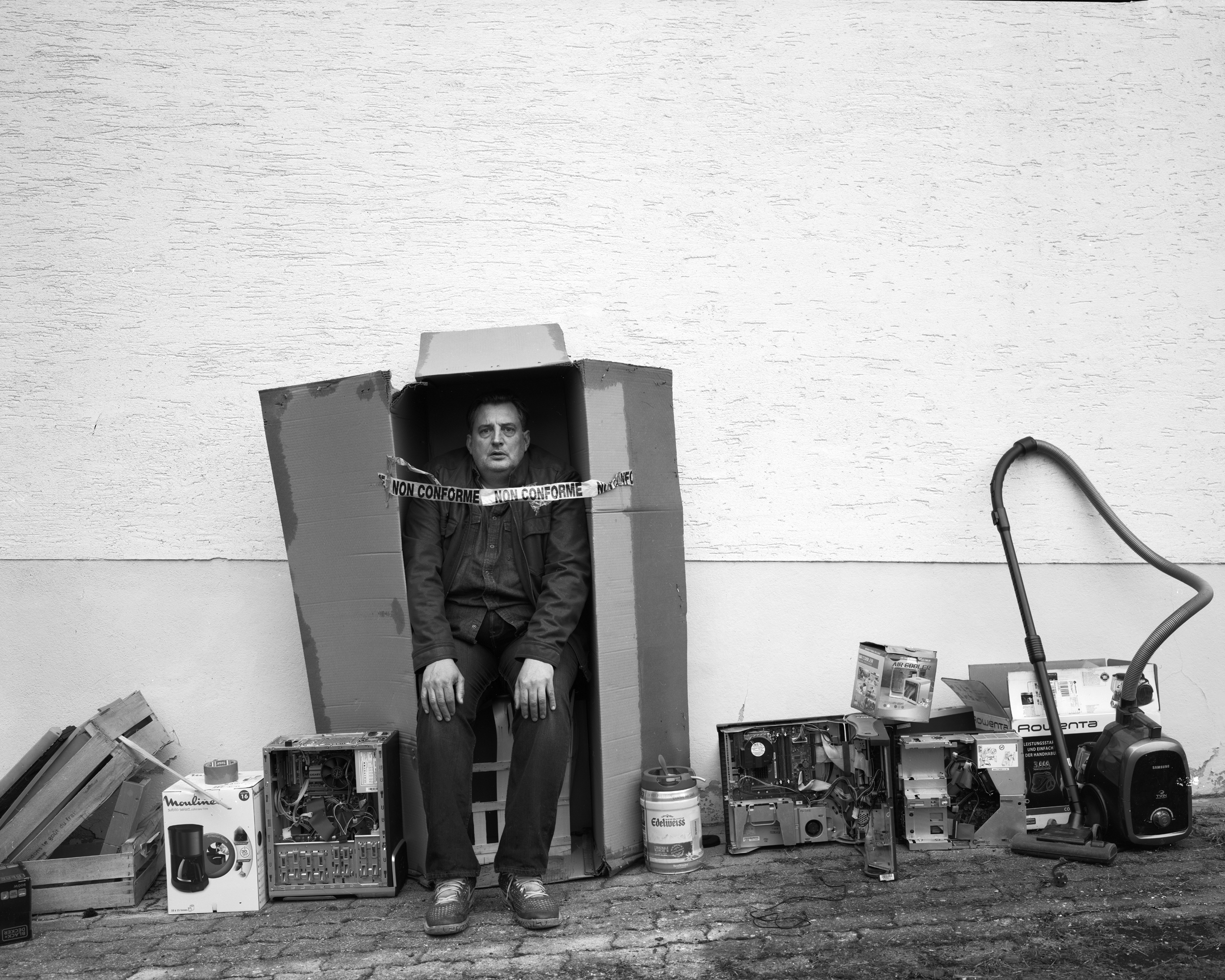 C’était le weekend dernier. Je voulais tester la chambre 8×10 prêtée par un ami suisse et du coup j’ai profité de la présence d’un copain pour le faire et pour mettre en scène cette photo un peu décalée. J’avais rassemblé des tas de trucs à balancer à la déchetterie et du coup j’ai étalé le tout pour simuler un tas d’ordure dans une rue avec moi dedans.