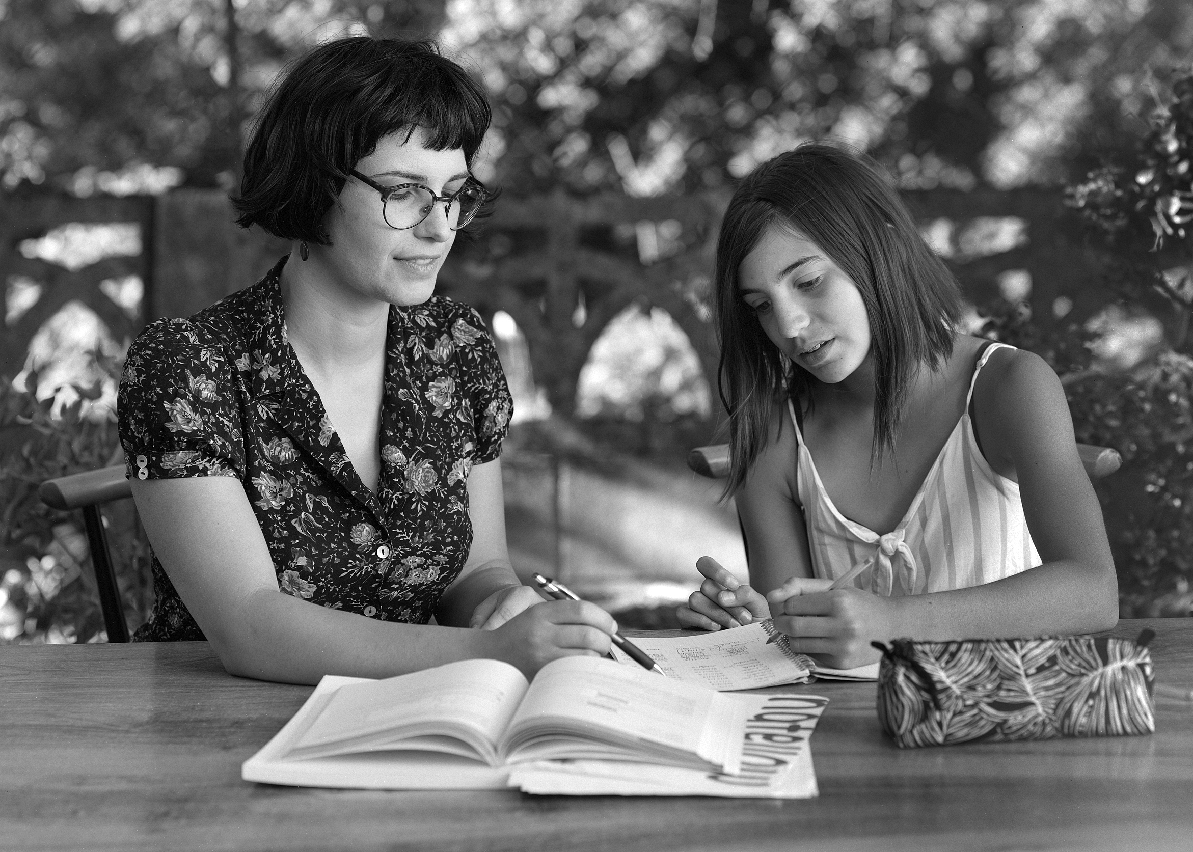 C’était mercredi, Valentine la femme du patron du bar m’avait demandé de lui faire des photos pour son site Internet de cours particuliers. Elle avait trouvé une de ses élèves, Flora, pour poser avec l’accord de ses parents. J’ai donc enchainé les prises de vue avec mon D300 et un 85mm 1,8 avant de leur demander de faire une photo posée à la chambre. J’ai choisi de prendre ma Sinar P 13×18. Il y a eu trois plans films exposés et c’est celui-ci que je préfère même si Valentine semble fermer les yeux alors qu’ils ne sont que baissés…