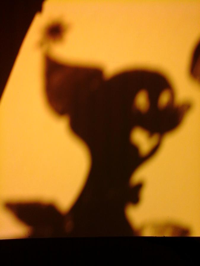 Il s’agit de l’ombre sur la table d’un bricolage sur vitre plus connu (du moins pour moi) sous le nom de windows colors. Il s’agit de peinture spéciale que l’on fait sur une vitre pour la décorer, la couche est plastique et épaisse et peut donc se décoller à la spatule lorsque l’on en a marre. Cette photo c’est donc l’ombre de Bambi personnage bien connu du dessin animé éponyme de Walt Dysney.