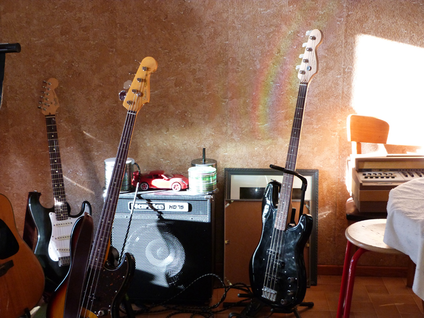 Cette année, je prends le travail à 11h00 le lundi matin. Ce lundi en partant vers 10H00 de chez moi, je passe devant la porte de la salle du bas où est installé mon matériel musical et j’observe amusé que pour des raisons qui m’échappent un peu, un arc en ciel se dessine sur le mur tout près de la basse de Sarah.