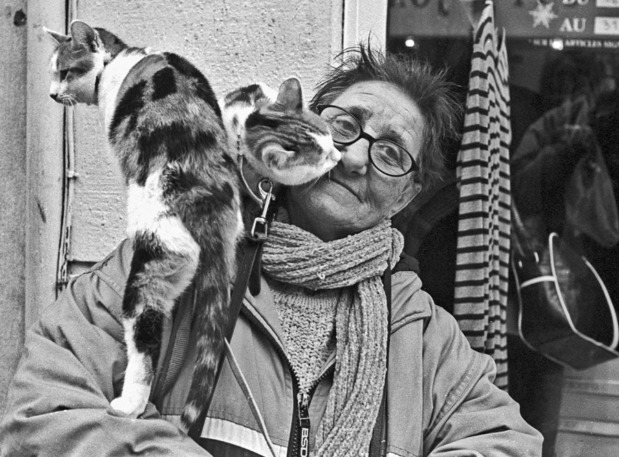 Photo prise dans la rue il y a pas mal d’année de cela. J’avais donné un peu d’argent à cette pauvre dame et elle m’avait autorisé à la photographier. Le moment était si beau avec ce chat qui sentant sa tristesse tente de la réconforter en lui faisant un bisou de chat, que ça a donné une photo que je trouve très forte. Reste le sentiment de honte que je ressens encore aujourd’hui. Quand à cette dame elle a quitté la rue quelques semaines plus tard. j’espère que les autorités municipales lui ont trouvé un domicile pour elle et ses chats bien sûr.