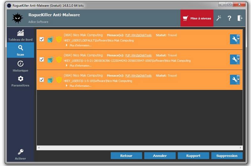 La preuve, voici ci-dessus le tableau de chasse de ce cher ami : trois P.U.P ( un acronyme anglais signifiant programme potentiellement indésirable). Ce n’est pas très grave mais cela peut ouvrir une brèche pour d’autres saletés bien plus virulentes, ces logiciels posant donc une menace pour la sécurité de mon ordinateur principal, je me dépêche de les supprimer. Rogue killer les a trouvé en utilisant en plus de sa banque de données son mode heuristique, en clair Rogue Killer désigne comme dangereux des logiciels actifs sur votre machine si ils se comportent comme des menaces et ce même si il ne sont pas dans la liste officielle des saletés reconnues de dangerosité publique.