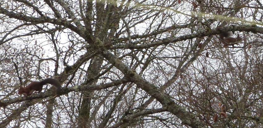 Plus tard alors qu’avec mon petit groupe de musiciens nous étions en train de préparer une nouvelle répétition, une des gamines remarque un écureuil qui fait des acrobaties dans un arbre de la cour de l’école. Du coup c’est le groupe entier qui se retrouve collé à la fenêtre pour observer l’animal. Et là je me rend compte qu’il n’y a pas un écureuil mais bien deux, il s’agit d’un couple.
