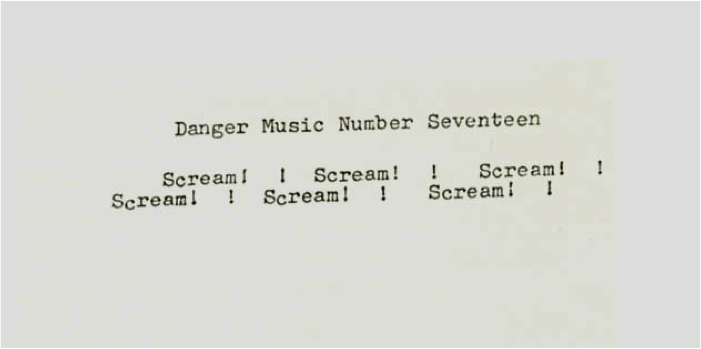 Mais la danger music est allée bien plus loin, car comme son nom l’indique ce genre de musique utilisait des objets et machines improbables tout en mettant en danger la sécurité voire la vie du public. Dick Higgins est le précurseur de ce style et écrivait ses partitions sur des petits bouts de papier en voici un exemple gentil :
