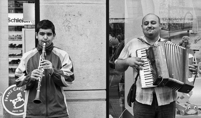 Samedi 30 mai dernier. J’étais dans les rues de Genève avec mon canon EF et son FD 85mm 1,8 SSC. Pendant que mon frère mon neveu et ma mère vont de magasin en magasin, je reste dans la rue et je photographie tout ce qui semble intéressant. La pellicule faite avec le Canonet sera un échec retentissant mais fort heureusement sur celle faite avec le reflex j’arriverai à trouver quelques bonnes prises comme ce double portrait que j’ai recadré de façon à jouer avec cette bordure de vitrine noire qui sépare l’image en deux faisant croire en une juxtaposition de deux portraits alors qu’il s’agit d’une seule et même photo.