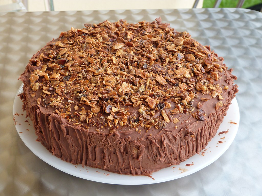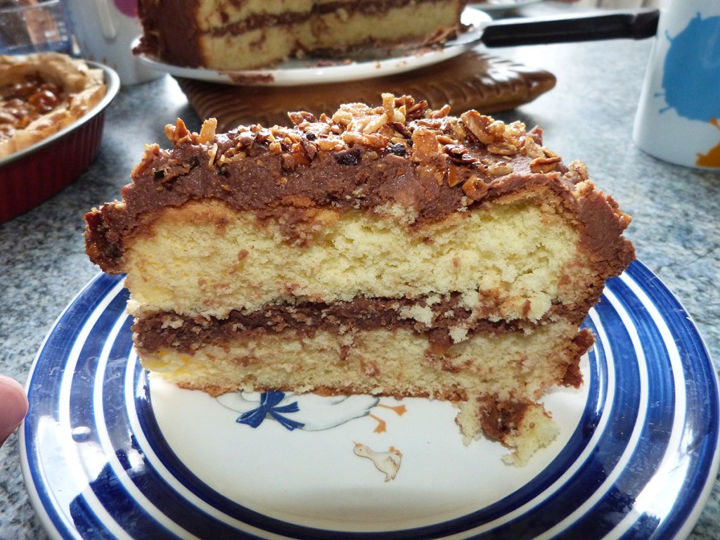 Bon alors oui c’est encore un peu brouillon ce n’est que mon troisième gâteau, mais j’en suis fier car bien que trop nourrissant il est très savoureux car il met en place une alliance entre le chocolat pâtissier au lait et les amandes que j’ai caramélisées moi-même. 😀