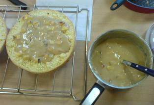 C’est vrai, la crème pâtissière avait une drôle d’allure, en absence de gousse de vanille j’ai utilisé de l’extrait de vanille, un liquide brun foncé qui a donné cet aspect brunâtre à la garniture composée de deux brugnons coupés en très petits morceaux par les enfants.