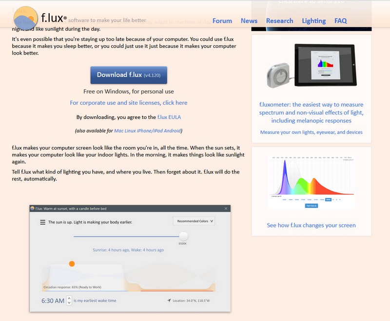 Aujourd’hui je vous présente (enfin si vous ne le connaissez pas encore) un petit programme qui nous veut du bien. Il s’agit de F.lux un logiciel minuscule gratuit et sans saletés qui fait varier l’éclairage de votre écran selon le moment de la journée pour épargner vos mirettes. Il comprend aussi des fonctions de réglage des couleurs peut-être pas du niveau d’une calibration mais bon je n’ai pas encore le temps de tester. Il fait faire quelques réglages au niveau de l’installation et je ne pense pas qu’une version française soit prévue mais bon si ça vous intéresse, le lien est au dessus.