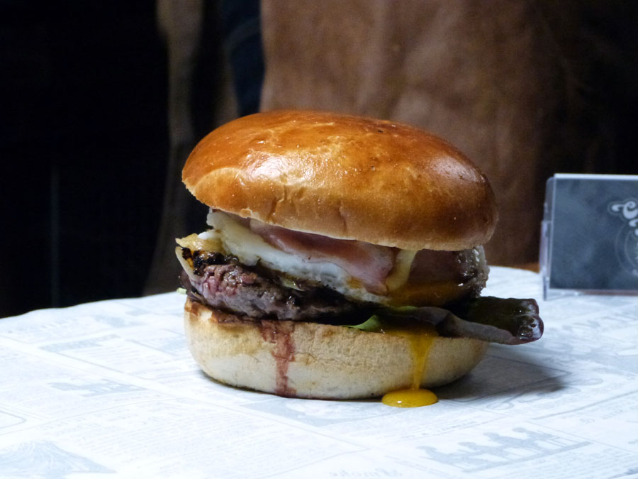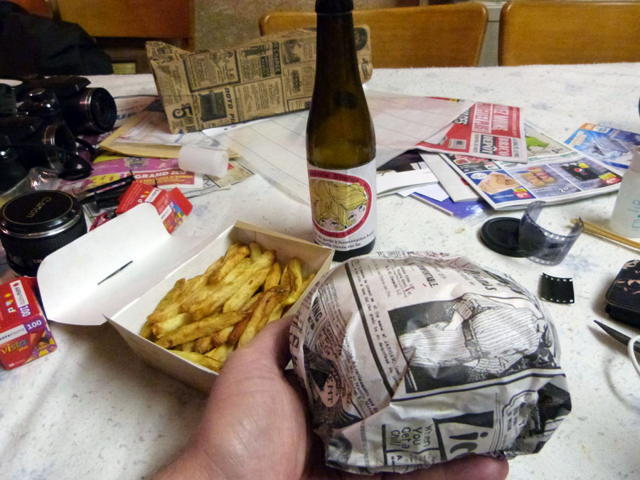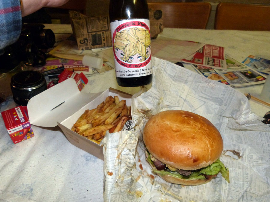 Lorsque je regarde mes statistiques je vois que c’est le mardi que j’ai le plus de visites. Peut-être des gens qui se demandent si je vais finir par me suicider… Alors non je ne vais le faire ces temps-ci et non je ne vais pas mieux. Mes pensées ce soir sont encore plus sombres que celles de la semaine dernière. J’ai donc appliqué le même remède, une bouffe bien grasse et répugnante dont l’achat a été facilité par l’apparition au village d’un nouveau food truck. Du coup au lieu de vous faire peur avec la noirceur de ce que je porte en moi, je vous montre les photos de ce que j’ai dégusté ce soir: un burger décadent fait avec des viandes locales d’un boucher traiteur très réputé de ma région. Notez le niveau de la présentation, ça vaut des points ! La bière du patelin du coin est quant à elle hélas un peu loupée. Son acidité relevée sur trois canettes montre sans équivoque une contamination du brassin aux ferments lactiques, un incident très commun chez les petits brasseurs qui ne stérilisent pas assez leur matériel. Cela a été maladroitement camouflé par un ajout de sucre mais bon ça passe et le goût est au final intéressant. 🙄