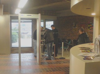 Ce matin je n’étais pas tranquille, j’ai donc demandé à mon chef de service de m’accompagner au tribunal. Le voici de dos sur la photo ci-contre en train d’essayer pour la cinquième fois de passer le portique du détecteur de métaux… Quelques instants de rigolade avant la suite, nettement moins marrante.