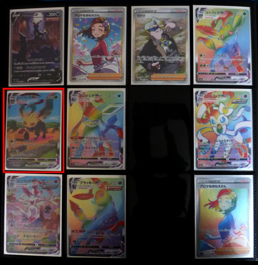 Vu que les choses vont mieux et que je me suis privé de beaucoup de choses pendant les dernières crises familiales, je me suis acheté une des trois dernières cartes qui me manque pour finir la série Eevee Heroes en japonais. C’est celle que j’ai encadrée en rouge, une grosse bébête (Phyllali) qui sous l’effet d’un rayon grandissant, joue avec une balle de foin comme un chat avec une baballe. C’est dur à comprendre pour les non initiés mais si on connait cet univers, cette vision c’est du pur bonheur.