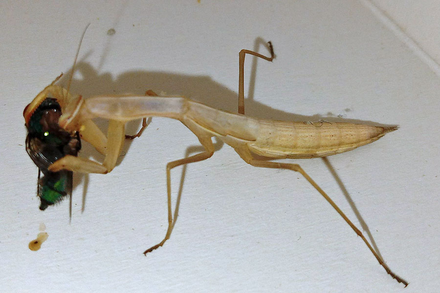 C’était une mante religieuse de notre région, petite, affamée et assez affaiblie. Je l’ai amenée prendre l’apéro avec moi chez le copain et depuis je lui donne une à deux mouches par jour, des mouches vivantes sinon elle ne les touche pas. 😈