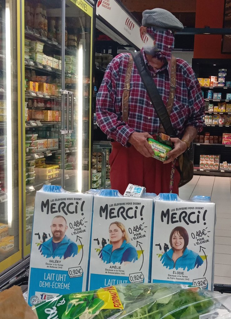Aujourd’hui j’ai du faire les courses, une corvée d’autant plus fatigante que cela faisait trois semaines que je ne les avait pas faites. Le magasin était rempli de personnes laides et stupides, je grognais comme un animal pour qu’elles s’écartent de moi. Puis tout d’un coup j’ai vu cet homme entre deux rayons. J’ai osé le photographier en mode discret. J’ai flouté son visage par respect bien sûr mais croyez moi avec son pantalon rouge, son sac en cuir, ses belles bretelles et son regard bleu c’est un rêve pour un portraitiste.