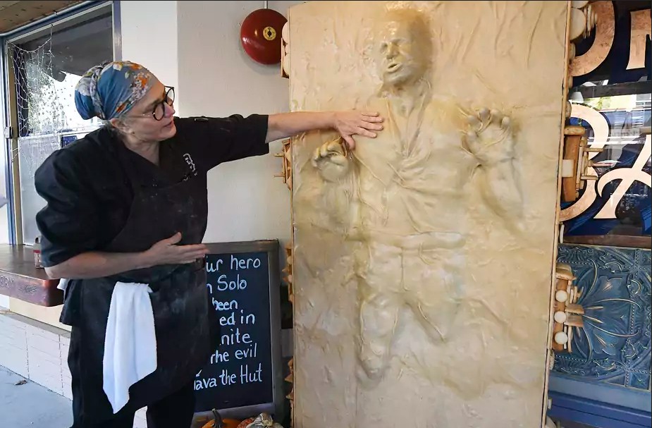 Cette année; Catherine aidée par sa mère qui est aussi la cogérante de la boulangerie, ont décidé de frapper fort en recréant un Ian Solo congelé dans la carbonite (cf. épisode V de la saga). Pour ce faire ces deux dames ont passé des semaines à mouler chaque partie de ce chef d’œuvre en utilisant du pain sans levure et saturé de sucres pour prolonger sa conservation.