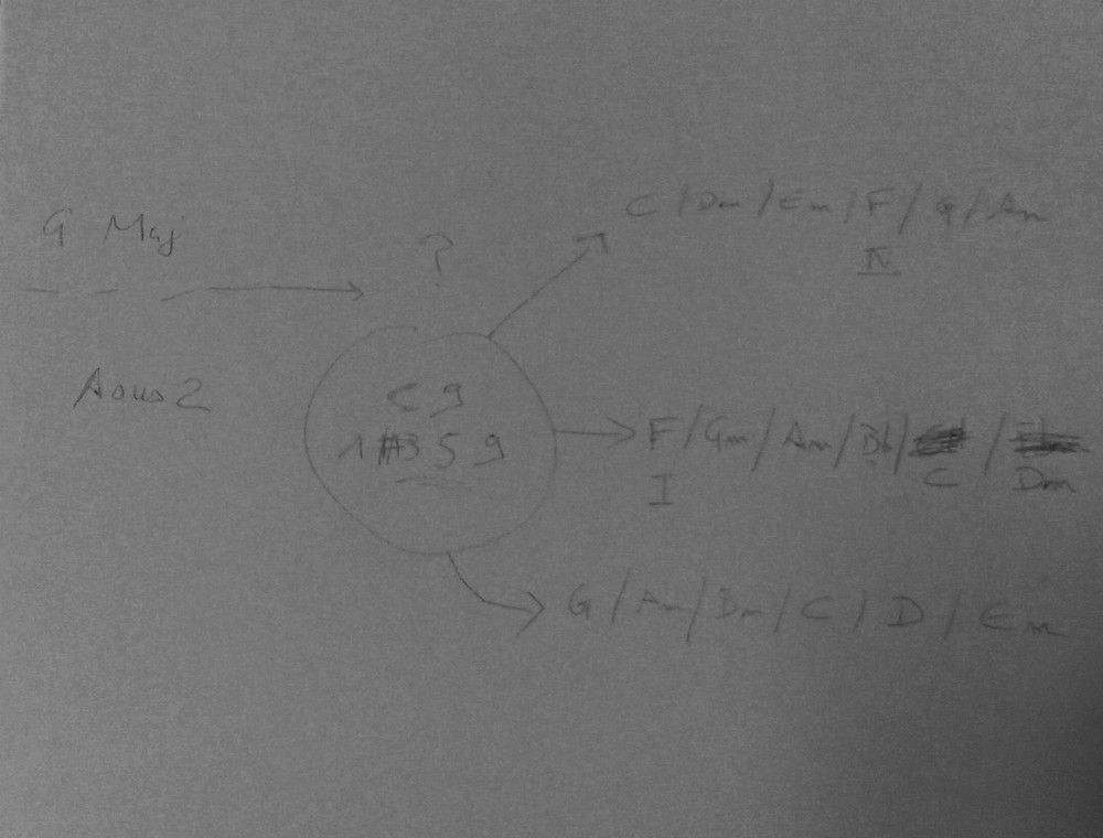 Aujourd’hui j’en reparle à mon prof qui me fait un cours ultra complexe sur la théorie autour de la composition et qui accepte de me montrer le chemin avec ce schéma qui vient délimiter les possibles (faire un changement de tonalité pertinent en utilisant les modes) tout en me donnant des conseils de fond. Il me suggère par exemple de composer un refrain simple et droit pour contraster avec mes couplets planants.