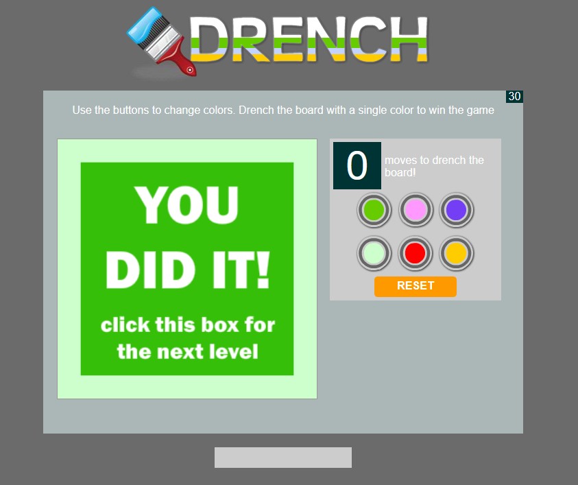 Alors ça s’appelle « Drench » (tremper) et le but est simple, vous choisissez 29 fois une couleur dans la palette à droite pour réussir à peindre tous les carrés de la même couleur. C’est très bête mais aussi très prenant, je vous aurai averti.