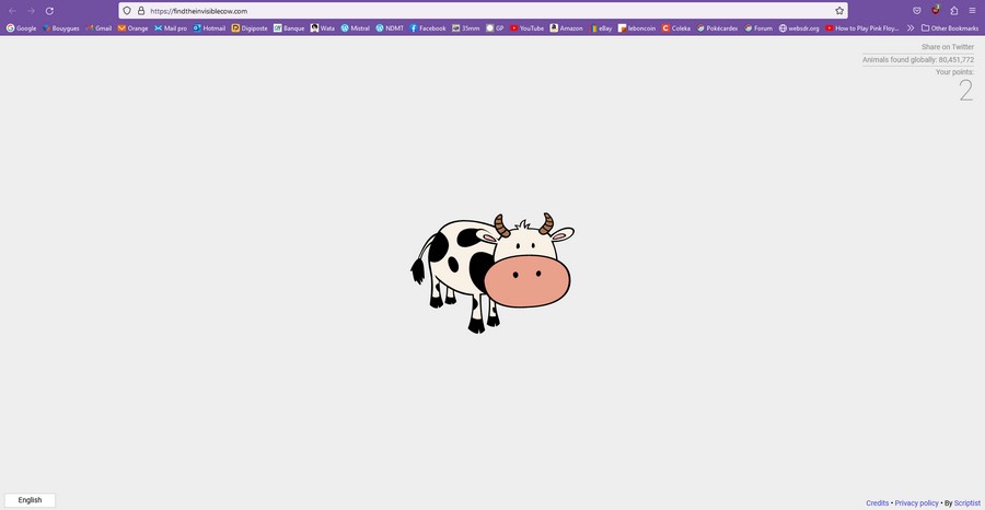 Chercher la vache Publié le 10 Mai 2023 par Kimihiro Watanuki https://findtheinvisiblecow.com/ Un jeu stupide et inutile pour les longues journées pluvieuses du mois de mai… Partager : Cliquer pour partager sur X(ouvre dans une nouvelle fenêtre) X Cliquez pour partager sur Facebook(ouvre dans une nouvelle fenêtre) Facebook J’aime chargement…