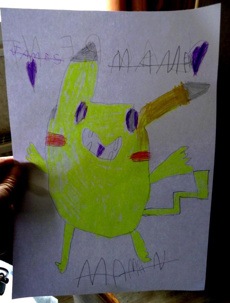 Pour ce faire il m’a demandé d’épeler chaque lettre avec soin. Et le voici tout fier de me donner ce dessin preuve de ses débuts d’artiste et de sa ténacité pour écrire un nouveau prénom et aussi de son obstination car ce dessin n’a pu être réalisé qu’en harcelant la secrétaire jusqu’à ce qu’elle lui donne du rouge pour faire les joues de son Pikachu ! Là encore c’est de ma faute car je lui avait rappelé ce détail important pour faire un dessin de Pikachu qui se respecte.