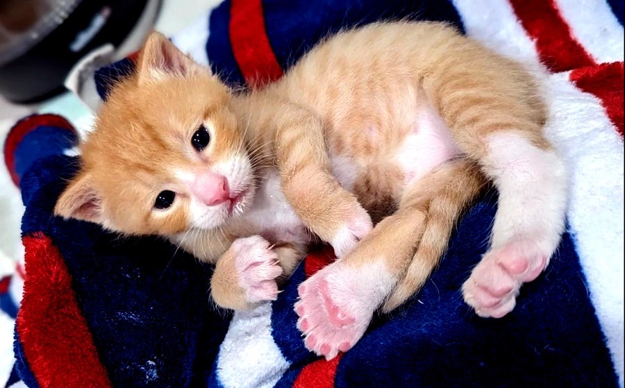 Dès le début, Jacqueline a commencé par un programme spécifique de kinésithérapie pour détendre ses tendons. Après chaque biberon, soit à quelques heures d’intervalle, la volontaire massait et étirait les pattes du chaton. Progressivement, les tendons se relâchaient et l’état du chaton s’améliorait. Macaroni a même commencé à montrer sa personnalité. Le chaton roux joueur, câlin, curieux et intrépide n’a pas tardé à vouloir partir en exploration du haut de ses grosses pattes tordues et sa démarche chancelante.
