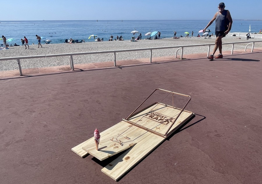 Oui vous l’avez compris, en ce moment sur la côte d’azur, l’artiste de rue « TooLate » qui à l’instar de Bansky cache son visage et son identité, a décidé de dénoncer les ravages que le tourisme de masse cause à l’environnement du littoral en utilisant des tapettes géantes destinées à capturer les touristes.
