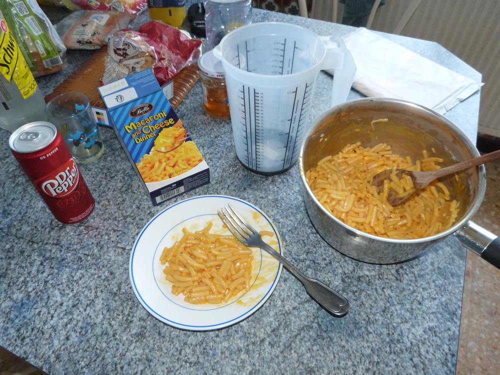 Pour le reste des choses débiles qui ont ponctué cette dernière journée de vacances, j’ai mangé le fameux « Mac and cheese » chimique américain constitué de pâtes de très mauvaise qualité et de fromage dénaturé en poudre; C’est dégouttant et sans aucune valeur nutritive, trois cuillères à soupe dans ma bouche, le reste aux toilettes !