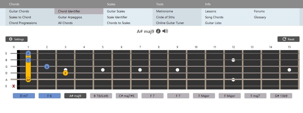 Il y a quelques semaines, je me suis dit et bien demandons à Goggle si il existe un outil en ligne et voilà que oui j’ai trouvé ! https://www.all-guitar-chords.com/chords/identifier est un site juste incontournable lorsque l’on s’amuse à expérimenter des trucs comme je le fais mais avec plus de talent bien sûr ! 😆