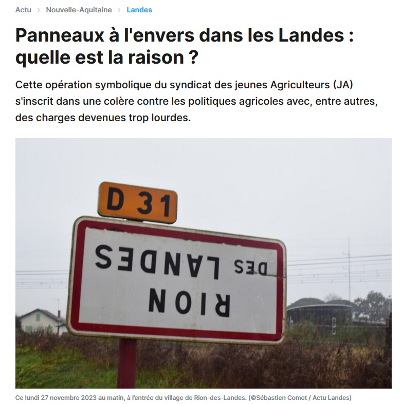 Je voulais parler de ça ce soir raconter que chez moi en Franche comté j’ai aussi des panneaux retournés et que le sens profond de l’opération c’est de dire qu’en matière de politique agricole, vu que l’on marche sur la tête, autant retourner les panneaux qu’on puisse bien les lire. Je vous laisse développer le contenu et le propos, moi j’ai rendez-vous avec un instant torture… 😥