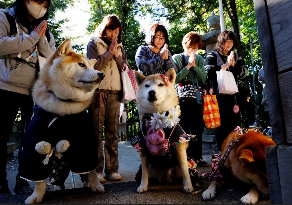 Mardi dernier, de nombreux propriétaires d’animaux de compagnie ont monté les marches abruptes de l’Inuneko Jinja, le sanctuaire des chiens et des chats, pour prier et recevoir la bénédiction d’un prêtre shintoïste. Six chiens Shiba Inu vêtus de kimonos ont fait la queue pour des photos lors de l’événement.