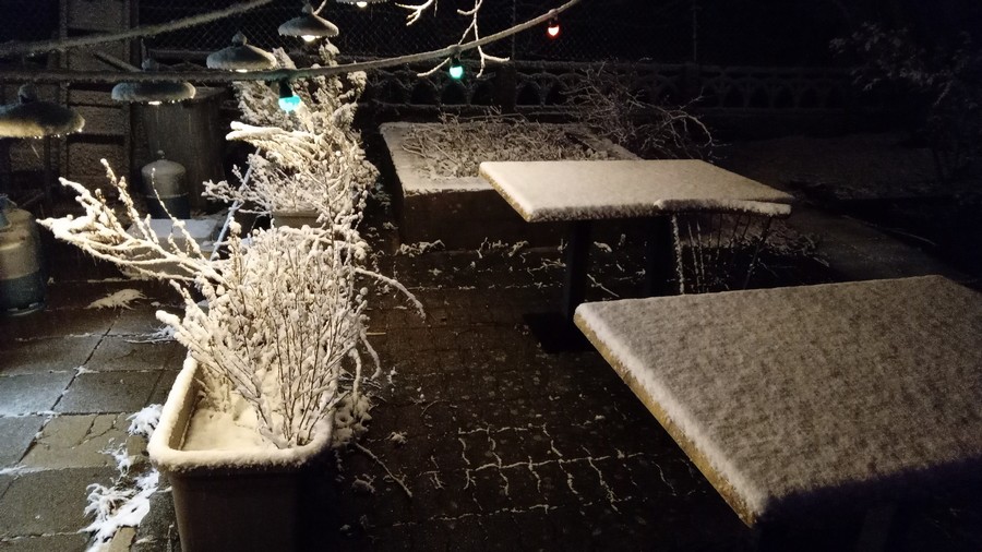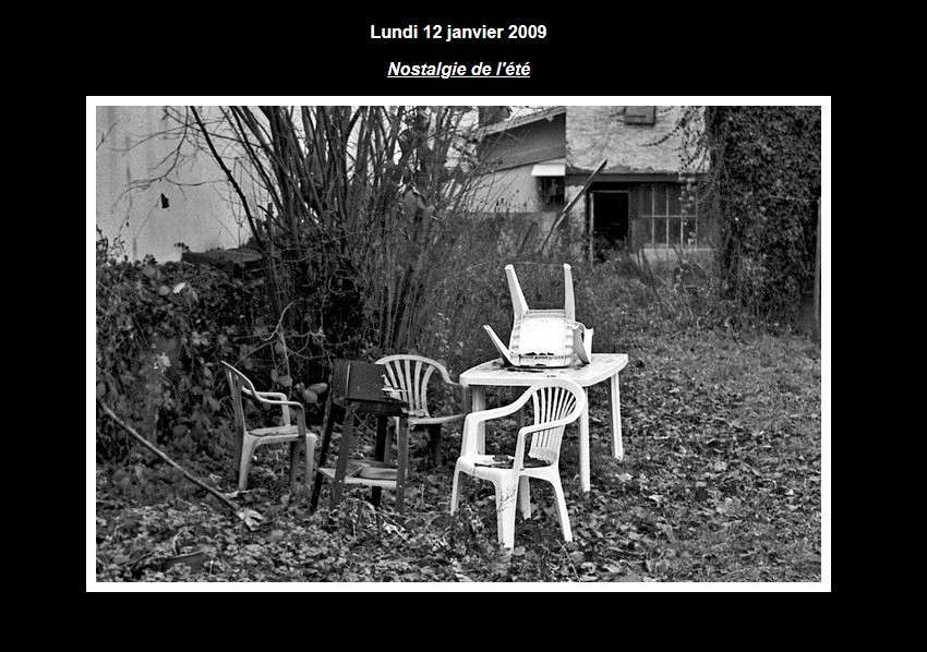 Jeudi soir au pub du village là ou je suis passé invité par un ami (je n’y vais plus seul depuis des années maintenant). En contemplant les tables vides et enneigées ainsi que cette guirlande d’ampoules multicolore claquée au sol, j’avais dans la tête cette chanson de Bourvil. C’est pour ça que j’ai décidé de faire cette photo avec mon téléphone portable… 😥