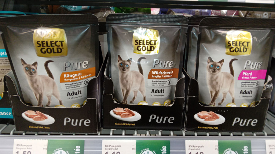 N’étant pas disponible pour me faire bouffer vivant et ayant besoin de mes mains et poignets pour faire mes cours de basse et le reste, j’ai donc décidé de faire un saut au magasin qui vend tout pour nos chers compagnons qui ont l’infortune d’être devenus des familiers. C’est alors que je suis tombé sur ce rayon, pour moi ça a été un choc !