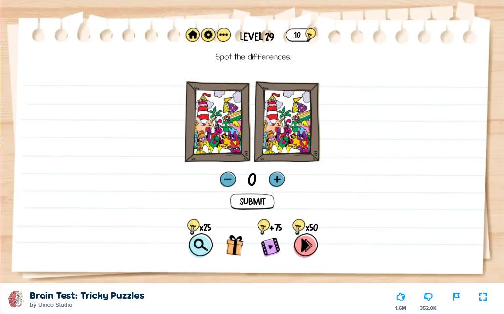 Et la solution c’est 0 car les deux images sont identiques ! Ce n’est qu’un exemple il y a encore bien plus tordu comme énigmes sur ce site qui vous permet aussi de jouer en français en cliquant sur la roue crantée dans le rond jaune à coté de la maison.