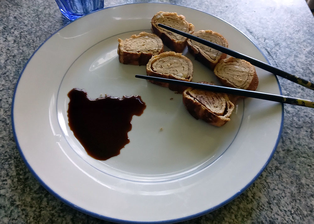 Du coup j’ai utilisé mes autres sens que ma vue et j’ai surtout beaucoup réfléchi à mes précédentes erreurs. J’ai réfléchi à la façon dont cette poêle rectangulaire répartissait la chaleur et j’ai profité des différences de température dans chaque zone pour définir ou je devais rouler et où je devais laisser cuire doucement… J’ai aussi utilisé une huile d’olive très pure que je n’ai pas fait trop chauffer. Bref, j’ai maîtrisé comme si un cuisinier japonais était là pour me conseiller !
