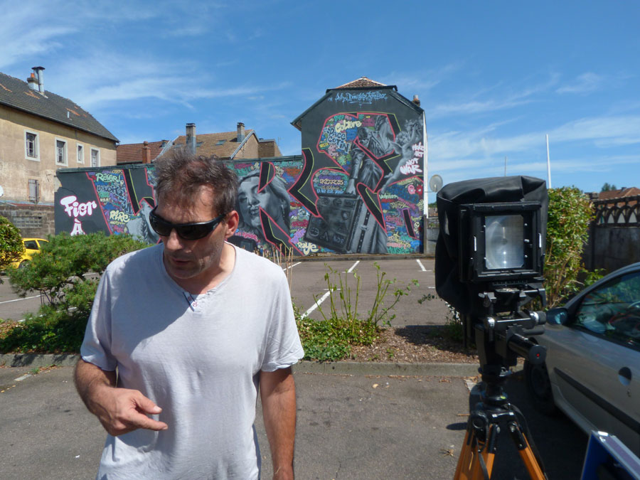 J’ai passé la journée avec le copain Florian pour mener à bien un projet un peu débile, photographier des fresques murales imposantes dans une ville à 70km de chez moi en utilisant une chambre, (ma Sinar F2, la plus compacte et la plus qualifiée pour le job dans mon arsenal) et ce pour composer des images en s’affranchissant de plusieurs obstacles et en choisissant ce que je voulais faire rentrer dans mon image.