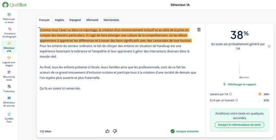 - Ne jamais faire de copié-collé stupide, des logiciels gratuits sont capables de détecter un texte écrit par une IA et sont donc très largement utilisés même si en même temps ils proposent « d’humaniser » le texte pour ne pas se prendre prendre. Démonstration avec l’outil gratuit Quillbot à qui j’ai donné ma conclusion dans laquelle j’ai gardé trois lignes (pourtant un peu réécrites) de ce que l’IA m’a servi (les fautes sont volontaires c’était pour aider l’IA à mieux lire):