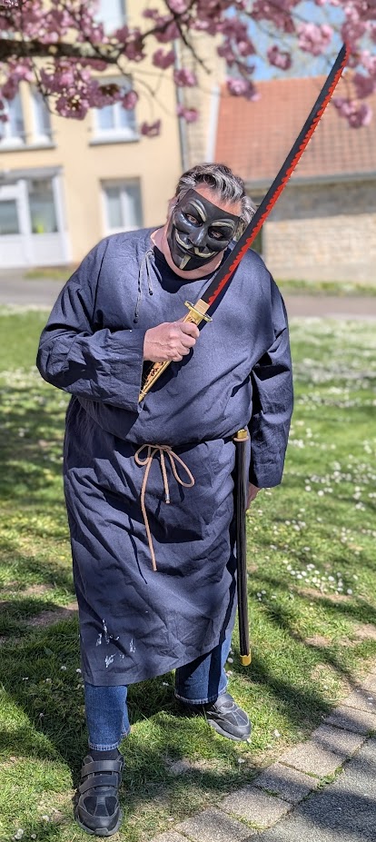 Cette semaine a été si riche que je dois renoncer à beaucoup de choses pour l’illustrer avec une seule photo. Je ne montrerai donc pas la remise de ma médaille du travail ni le plat dégoûtant servi à la cantine jeudi ni des images de ma journée en Suisse qui vient de s’achever. Non, je préfère montrer une photo de mon déguisement bricolé à la hâte pour le carnaval de l’école de hier vendredi 11 avril.