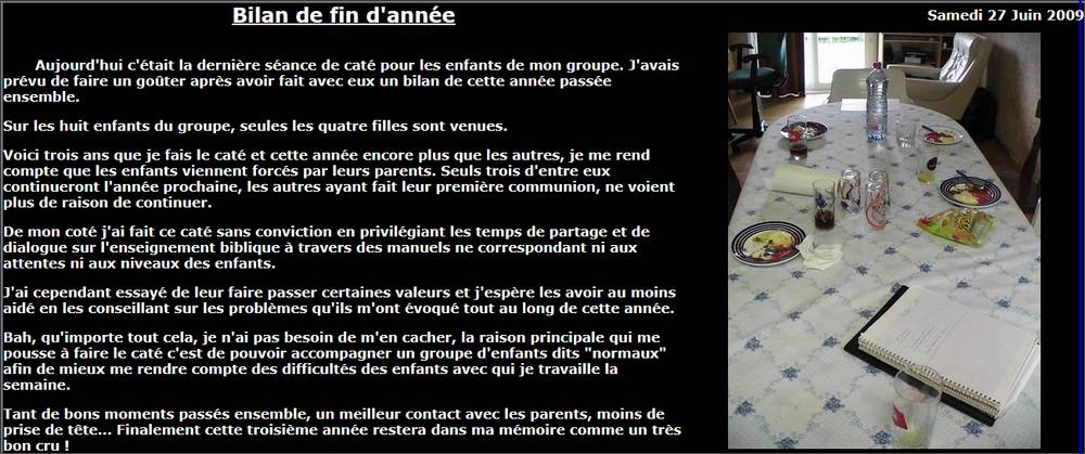Chaque année à la même période, je m’active pour terminer mes bilans de fin d’année. C’est un écrit professionnel très dense qui expose d’une part où j’en suis par rapport au projet de l’enfant et qui d’autre part parle de comment s’est passé l’année avant de donner des éléments qui serviront à construire le nouveau projet avec les parents en septembre.