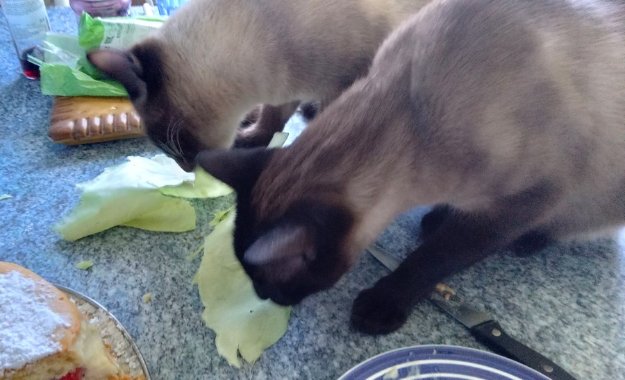 Je suis en train de préparer un chou farci pour ce soir et voilà ce que je trouve en entrant dans la cuisine, mes deux chats en train de manger des feuilles qu’ils ont détaché du chou !
