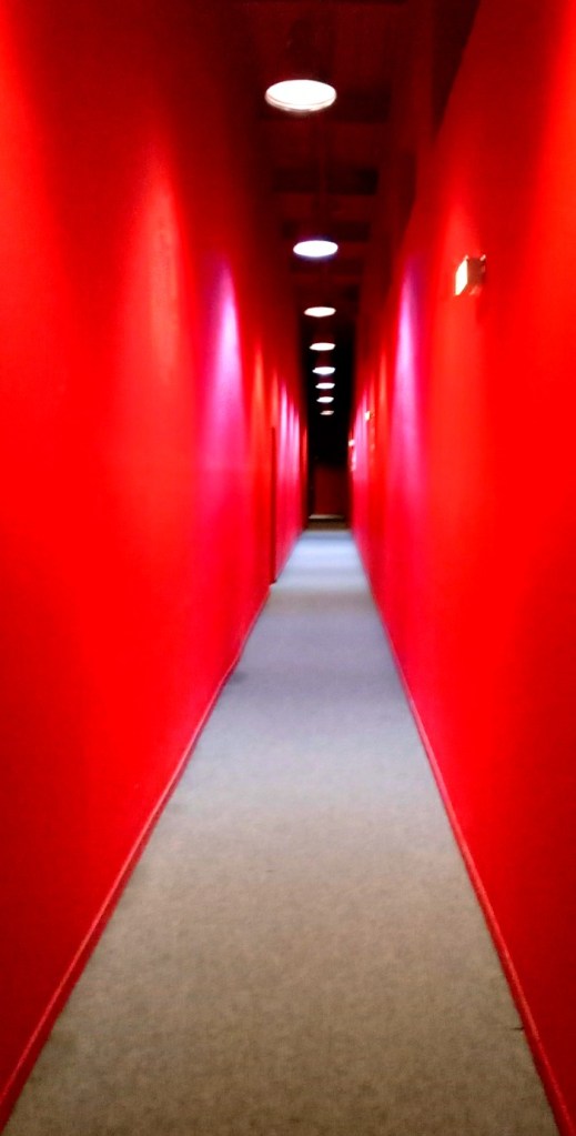 Dimanche j’ai été invité par une amie qui voulait voir le film d’animation japonais « Belle » Le film était très bien quoique un peu surprenant. mais là n’est pas le sujet. En sortant de ce multiplex, je me suis retrouvé dans ce couloir que j’ai trouvé assez graphique qu’angoissant. J’ai fait cette photo merdique avec mon nouveau téléphone portable et son format hyper allongé. J’ai bien sûr joué avec cette image en montant un peu la saturation des couleurs. Cela a été l’occasion de voir que cet outil est tout sauf un bon appareil photo (et c’est très bien ainsi vu que je déteste ces machins).
