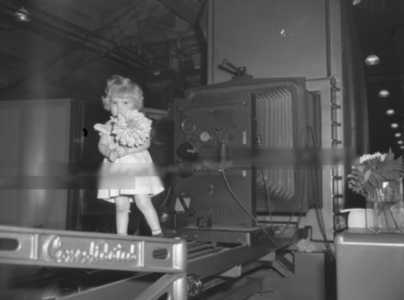 Cette photo a été prise dans un salon de l’impression à Chicago dans les années 50, la toute petite fille pose devant un gigantesque agrandisseur mural. J’aime bien cette photo pour son coté insolite et le contraste entre cette technologie froide et menaçante et cette jeune gamine fragile et toute mignonne.